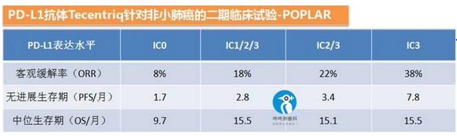 值得注意的是:這個臨床結(jié)果發(fā)現(xiàn)無論P(yáng)D-L1表達(dá)狀態(tài)如何,使用Tecentriq都會比使用多西他賽的患者OS更長。之前就有Tecentriq針對非小肺癌的二期臨床POPLAR 研究,發(fā)現(xiàn)PD-L1表達(dá)量越高,Tecentriq的效果越好。IC0代表PD-L1陰性,IC1/2/3代表PD-L1陽性,IC3是強(qiáng)陽性。具體的臨床數(shù)據(jù)如下:
