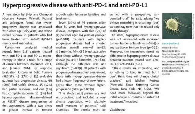 Champiat在接受采訪時說:“這只是初步回顧性研究數(shù)據(jù)、而且研究群體多樣復雜,標本數(shù)量小”,“所以,對資料數(shù)據(jù)解讀應與前瞻隨機設計的實驗資料對比解讀判斷。而且,我們目前雖然不能說這種超進展情況與治療直接有關,但相信某種情況確實是在發(fā)生著”。