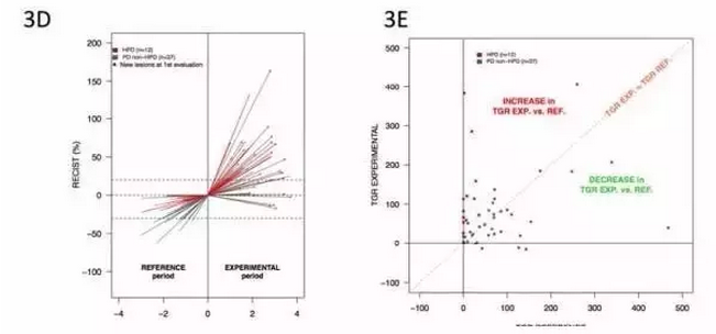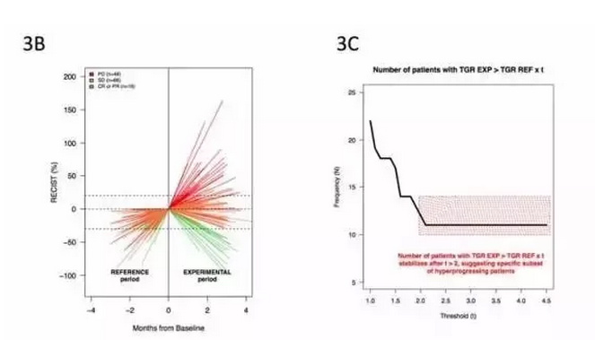 為了識別出癌癥疾病進展了的群體,研究人員計算了滿足以下條件的患者數(shù):治療后的TGR> 治療前TGR x t,其中t是整數(shù)閾值(從1到5)。t為2,3,4,5的就是疾病高度進展了的患者(HPD)。