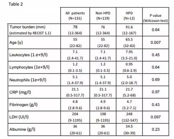 我們觀察到HPD相比非HPD患者年齡更高,這是非常值得重視的。這可能是老年患者與年輕患者有著不同的免疫學背景的原因,比如T細胞共刺激/共抑制蛋白表達,以及更高的炎癥細胞因子的濃度。同時,這與之前三個獨立報道的三期臨床實驗中老年人從藥物中受益較少的結(jié)果是一致的,這其中的機制非常值得研究。