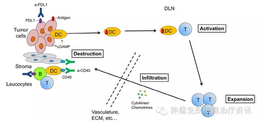 圖1:免疫治療和腫瘤微環(huán)境(TME)。免疫治療成功控制腫瘤需要免疫系統(tǒng)的激活,效應細胞擴增,活化的效應細胞對腫瘤組織的浸潤并破壞腫瘤細胞。免疫治療的目的旨在增強上述過程,而腫瘤屏障可以大大抑制它們。效應T細胞可以被TME中檢查點的分子,如PD-L1抑制。PD-L1的抑制作用可以通抗-PD1 / PDL1來克服。激發(fā)檢查點抗體用于激活免疫細胞。但是,一些抗體,如抗CD40也可以在基質細胞發(fā)揮優(yōu)化腫瘤控制的作用。將ECM形成腫瘤屏障阻止T細胞到達TME破壞腫瘤。另一方面,淋巴細胞向TME中的浸潤可以通過細胞因子/趨化因子的誘導/遞送得到增強。