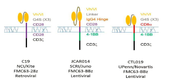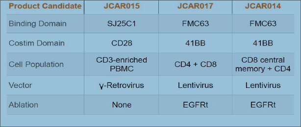 Juno Therapeutics (JUNO)則與上述的三家醫(yī)學(xué)機構(gòu)合作。在2016 6月ASCO上報道的臨床研究中,51名復(fù)發(fā)或難治性(r / r)急性淋巴細(xì)胞白血?。ˋLL)成年患者用環(huán)磷酰胺或氟達(dá)拉濱/ 環(huán)磷酰胺,然后輸注JCAR015。隨訪研究觀察到90%的完全緩解率(CR)。然而在同年7月6日,JCAR015在Ⅱ期臨床試驗中導(dǎo)致2例患者腦水腫死亡而被叫停。JUNO認(rèn)為是由于CAR-T治療前用藥氟達(dá)拉濱引起。但是去除氟達(dá)拉濱后繼續(xù)臨床試驗,11月23日又出現(xiàn)了三個腦水腫死亡病例,JUNO不得不終止JCAR015臨床試驗,痛失了在CAR-T的領(lǐng)先地位。JUNO將其重心轉(zhuǎn)向其它產(chǎn)品,JCAR17 和 JCAR14等。它們的區(qū)別見圖9。