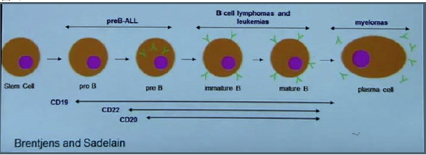 從圖8中看出,CD19在pre-B 和 成熟B細(xì)胞,包括正常和惡性增殖的B細(xì)胞表達(dá), 但是淋巴干細(xì)胞和成熟漿細(xì)胞沒有CD19。帶有抗CD19 scFv 的CAR-T 細(xì)胞可以攻擊pre-B 和成熟B細(xì)胞而不傷害淋巴干細(xì)胞,保留了淋巴干細(xì)胞的再生功能。使用抗CD19的CAR-T細(xì)胞進行