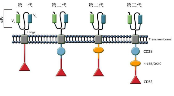 細(xì)胞內(nèi)信號轉(zhuǎn)導(dǎo)區(qū)主要為CD3ζ或FcεRIγ含有免疫受體酪氨酸活化基序(immunoreceptor tyrosine-based activation motifs, ITAM,)以及第二刺激信號CD28或者其它分子,4-1BB, OX40等正向協(xié)同刺激信號。根據(jù)CAR結(jié)構(gòu)的進化,有第一代,第二代和第三代。幾代CAR-T的區(qū)別在于細(xì)胞內(nèi)信號轉(zhuǎn)到區(qū)連入了不同的正向協(xié)同刺激信號:第一代CAR(左)由單鏈抗體通過跨膜區(qū)域與胞內(nèi)信號傳導(dǎo)區(qū)(ITAM)相連, ITAM通常為CD3ζ或FcεRIγ; 第二代CAR(中)的胞內(nèi)信號轉(zhuǎn)導(dǎo)區(qū)引入了共刺激分子, 主要為CD28 或4-BB; 第三代CAR(右)同時引入了兩個共刺激分子, 主要為CD28加上4-BB 或OX40。早期的實驗證明了CAR-T 的可行性,然而第一代CAR 只能引起短暫的T 細(xì)胞增殖和較低的細(xì)胞因子分泌,不能提供長時間的T 細(xì)胞擴增信號和持續(xù)的體內(nèi)抗腫瘤效應(yīng)。依照T 細(xì)胞活化的雙信號學(xué)說,T 細(xì)胞的激活和增殖需要兩個共刺激信號;第二代、第三代CAR 引入了共刺激分子信號序列,旨在提高T 細(xì)胞的細(xì)胞毒活性、增殖性與存活時間,并且促進細(xì)胞因子的釋放。