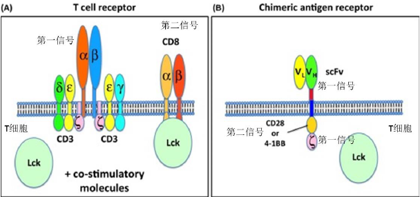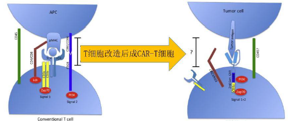 圖3, T 細(xì)胞兩個激活信號,CAR將兩個激活信號結(jié)合在一起。
