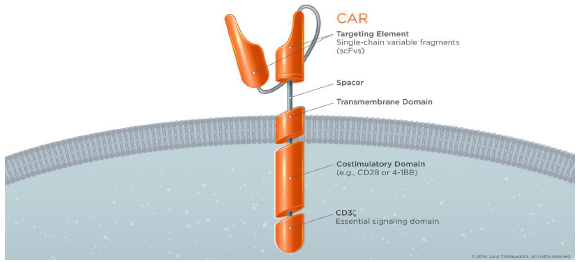 典型CAR的結(jié)構(gòu)由胞外抗原結(jié)合區(qū)、跨膜區(qū)域和胞內(nèi)信號轉(zhuǎn)導(dǎo)區(qū)組成。其中胞外抗原結(jié)合區(qū)來源于單克隆抗體的單鏈抗體 (single chain fragment variable. scFv),單鏈抗體是由輕鏈 (VH) 和重鏈 (VL)通過連接而形成的。scFv是CAR結(jié)構(gòu)里的第一個關(guān)鍵部位,它能識別腫瘤特異性抗原,即所說的靶點,比如CD19, EGFR等,而不是需要加工遞呈出來的抗原多肽。因此這樣的結(jié)構(gòu)解決了兩大問題:靶向性問題和繞開抗原遞呈的問題。(圖4,5)