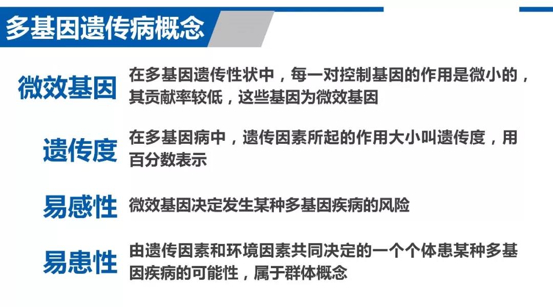多基因遺傳病,指遺傳信息通過兩對及兩對以上致病基因的累積效應(yīng)所致的遺傳病,其遺傳效應(yīng)較多地受環(huán)境因素的影響,其又被稱為復(fù)雜疾病。有關(guān)多基因遺傳病的幾個關(guān)鍵概念如下:
