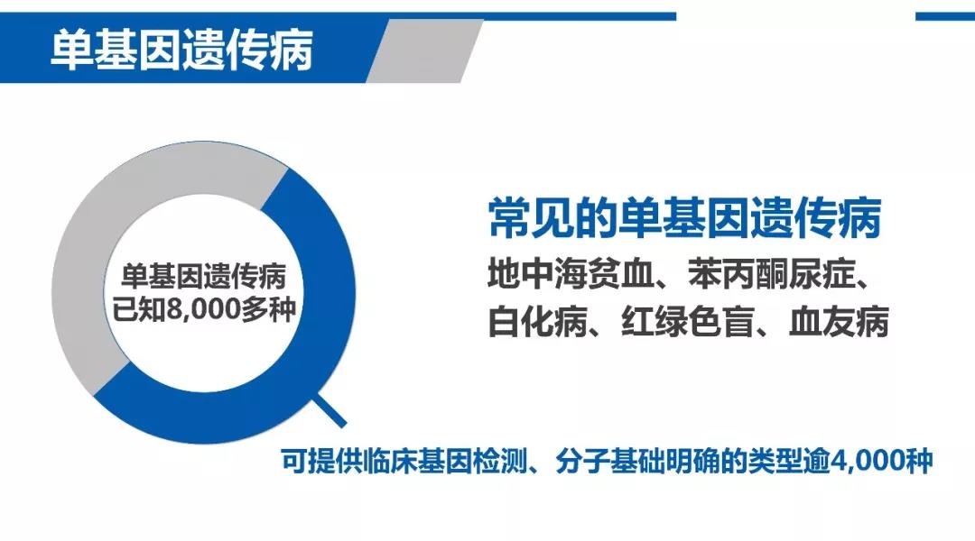 單基因遺傳病 (以下簡稱“單病”),由單個基因突變引起,突變基因可發(fā)生在常染色體或性染色體上,呈顯性或隱性。單病通常呈現(xiàn)特征性的家系傳遞模式。常見的單病有地中海貧血、白化病、苯丙酮尿癥、紅綠色盲、血友病等。這類疾病的發(fā)生由等位基因所控制,多數(shù)無法治愈,有個別疾病可以通過后天干預(yù)根治。所以,預(yù)防勝于治療,做好孕前基因篩查是預(yù)防單病的有效手段。