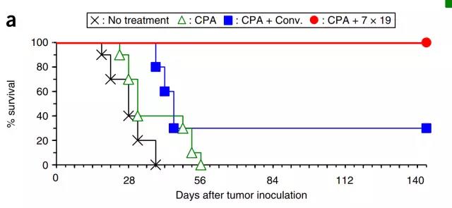 首先是肥大細(xì)胞瘤小鼠模型。接受適量環(huán)磷酰胺預(yù)處理后的肥大細(xì)胞瘤小鼠分別接受常規(guī)CAR-T或新一代CAR-T治療。結(jié)果Tamada教授發(fā)現(xiàn),常規(guī)CAR-T只能稍微改善肥大細(xì)胞瘤小鼠的生存,而新一代CAR-T可以使所有實(shí)驗(yàn)小鼠的腫瘤完全消除,同時(shí)在140天的觀察期內(nèi)沒(méi)有復(fù)發(fā)。