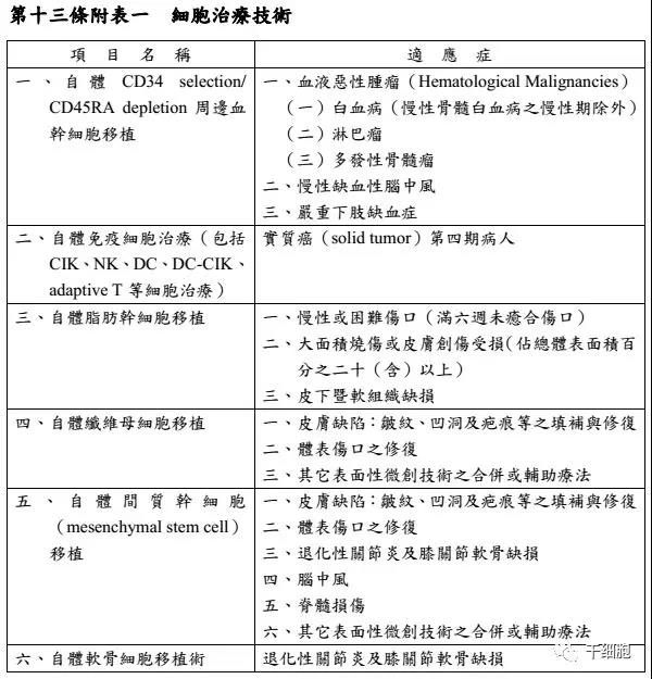 衛(wèi)福部考量病人需求,且鄰近國家如日、韓等國均積極投入細胞治療,決議開放已證明有初步療效的6項治療,以自體細胞使用為優(yōu)先。
