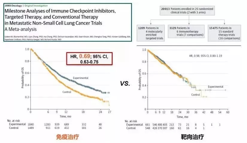 2017年,JAMA ONC曾經(jīng)發(fā)過(guò)一篇經(jīng)典文章,通過(guò)對(duì)非小細(xì)胞肺癌的25個(gè)臨床試驗(yàn),2萬(wàn)多名患者的大數(shù)據(jù)分析,發(fā)現(xiàn)參與免疫療法和靶向療法的患者,生存曲線(xiàn)非常不同。