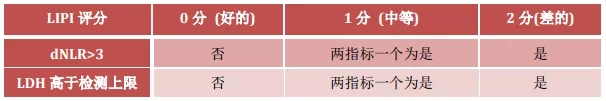 LIPI是綜合了兩個血液檢查指標(biāo):dNLR(中性粒細胞/淋巴細胞百分比)和LDH(乳酸脫氫酶)。具體的計算方法也非常簡單:如果dNLR大于3同時LDH高于檢測上限,得分是2,預(yù)后較差;如果dNLR小于3,同時LDH不高于上限,得分是0,預(yù)后較好;中間狀態(tài)得分是1,屬于中等水平。如下圖所示: