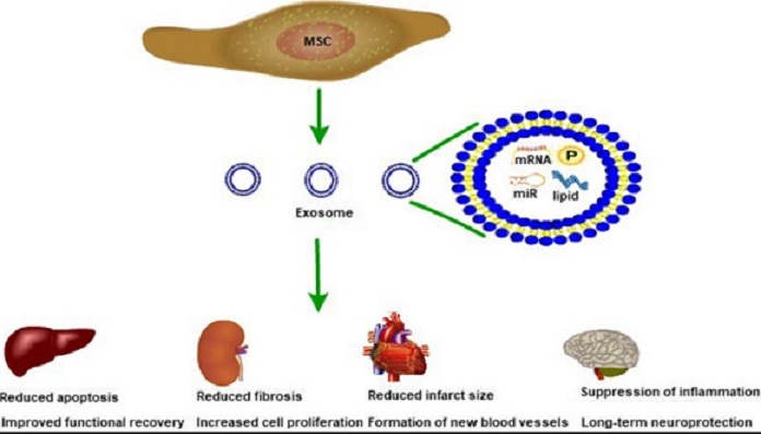 MSCs外泌體具有免疫調(diào)節(jié)、抗炎和抗纖維化、抑制氧化應(yīng)激、增強(qiáng)血管生成等作用。這主要依賴于其中的蛋白和核酸組分。例如MSCs外泌體富含糖酵解相關(guān)酶,可增加ATP的產(chǎn)生,減少組織細(xì)胞死亡。MSCs外泌體還含有VEGF、TGF-β1、IL-6、IL-10和HGF等細(xì)胞因子,有利于血管生成和免疫調(diào)節(jié)。2018年4月,FDA批準(zhǔn)了Aegle公司的首個(gè)細(xì)胞外囊泡新藥(IND)申請(qǐng),以開始用于燒傷患者的臨床試驗(yàn)。該公司通過分離純化MSCs分泌的細(xì)胞外囊泡,用以治療嚴(yán)重的皮膚病,包括燒傷和大皰性表皮松解癥。
