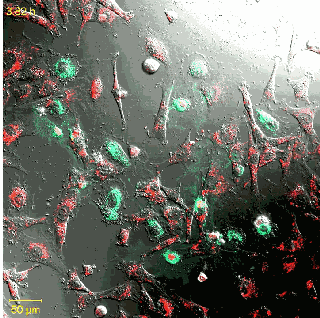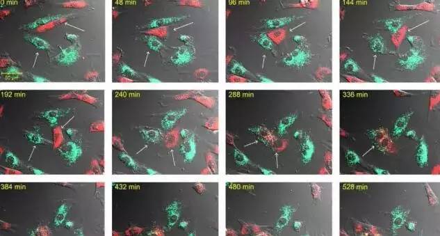 活細(xì)胞染為紅色,死亡的心肌細(xì)胞染為青色,間充質(zhì)干細(xì)胞不斷遷移,箭頭所指部位間充質(zhì)干細(xì)胞逐漸與死亡細(xì)胞融合成為雙核,400分鐘時(shí)死亡的心肌細(xì)胞開(kāi)始奇跡般地復(fù)活。