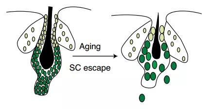 這種情況不算罕見,大約有5.8%衰老毛囊出現(xiàn)了這樣細(xì)胞“逃逸”的現(xiàn)象,而且有細(xì)胞逃逸的毛囊形態(tài)上明顯也比沒有逃逸的毛囊萎縮得更厲害。