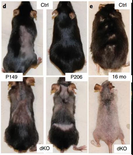 研究者敲除了小鼠的這兩個(gè)基因。幸運(yùn)的是,雙敲除小鼠身體基本上非常健康,壽命與常鼠無益;不幸的是,雙敲除小鼠從5個(gè)月大的時(shí)候就有了脫發(fā)的跡象,12-16個(gè)月大的時(shí)候更是基本失去了毛發(fā)。