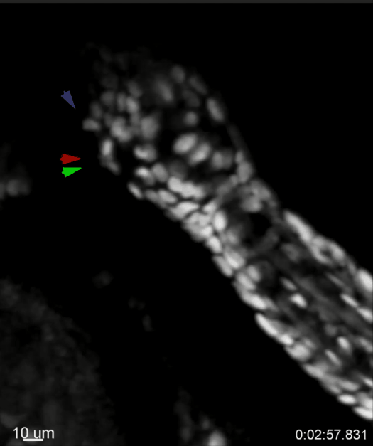 個(gè)別細(xì)胞能逃離得很遠(yuǎn),比如下圖紅色箭頭標(biāo)記的細(xì)胞就遷移了16μm,對(duì)細(xì)胞來說可是不短的一段距離了。