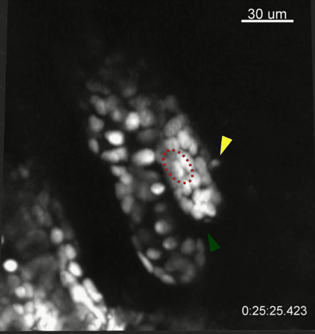 紅色圈內(nèi)是正在分裂的細(xì)胞,黃色箭頭標(biāo)記的是逃走的干細(xì)胞,綠色箭頭標(biāo)記的是正在凋亡的細(xì)胞。