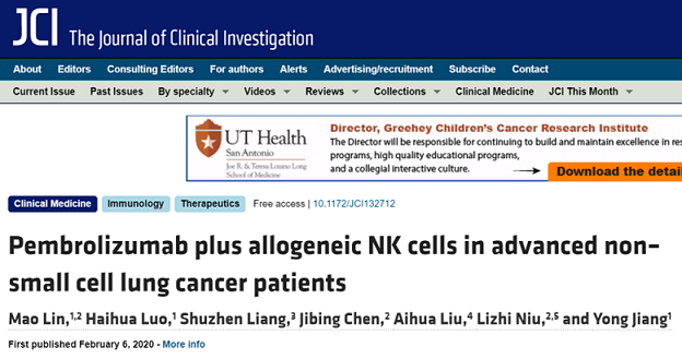 2020年5月,這個設想由國內(nèi)的研究團隊率先實錘,證實PD-1(派姆單抗,K藥)加同種異體NK細胞在先前接受過治療的晚期NSCLC患者中安全有效。并發(fā)表在國際頂級期刊《The Journal of Clinical Investigation》上。