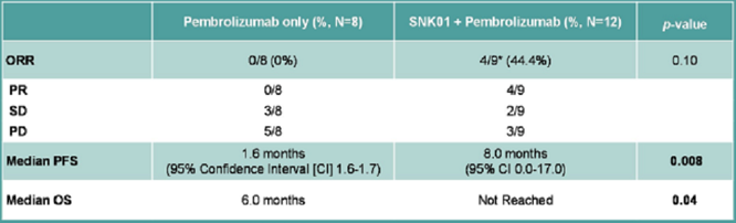 這項研究納入了20例IV期非小細胞肺癌(PD-L1 +,EGFR-,ALK-),這些患者接受了一線鉑類治療并失敗了,隨機分配至兩組:A組接受PD-1(派姆單抗)+SNK01治療(每六周2 x 10?或4 x 10?個細胞)B組患者僅接受派姆單抗,在21天周期的第1天注射。