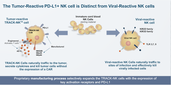CYTO-102是一種由PD-L1陽(yáng)性腫瘤反應(yīng)性NK細(xì)胞(TRACK-NK?) 組成的通用型細(xì)胞療法,通過(guò)對(duì)NK細(xì)胞進(jìn)行基因修飾以分泌高水平的可溶性IL-15。IL-15是一種免疫信號(hào)分子,在患者自身免疫系統(tǒng)的最佳抗腫瘤反應(yīng)中十分重要。在CYTO-102的制造過(guò)程中,IL-12、IL-18及其他信號(hào)分子可以誘導(dǎo)工程化NK細(xì)胞表達(dá)PD-L1,PD-L1陽(yáng)性TRACK-NK細(xì)胞可以自然定向到腫瘤微環(huán)境殺死癌細(xì)胞,并調(diào)節(jié)患者自身免疫系統(tǒng)的適應(yīng)性或T細(xì)胞反應(yīng)。