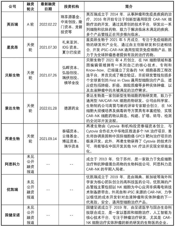 國內CAR-NK企業(yè)融資進展(數(shù)據(jù)來源:啟信寶; 康橙投資)
