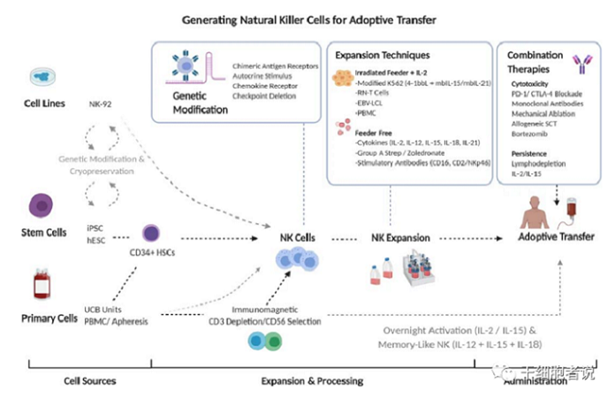 與其他免疫細胞類似,NK細胞療法的技術流程包括三部分:種子細胞、擴增制備、臨床使用。