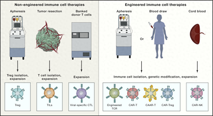 免疫細(xì)胞療法可分為非工程化免疫細(xì)胞療法和工程化免疫細(xì)胞療法。非工程化免疫細(xì)胞療法包括Treg細(xì)胞療法、TIL細(xì)胞療法和CTL細(xì)胞療法。工程化免疫細(xì)胞療法包含TCR-T細(xì)胞療法、CAR-T細(xì)胞療法、CAR-Treg和CAAR-T細(xì)胞療法。