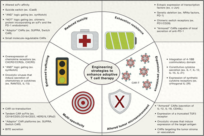 圖3.加強(qiáng)過繼性T細(xì)胞治療的工程策略[1]