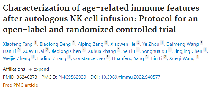 2022年9月,上海長(zhǎng)征醫(yī)院輸血科、上海交通大學(xué)免疫學(xué)研究所等單位聯(lián)合在《Frontiers in Immunology》上發(fā)表了一篇名為“Characterization of age-related immune features after autologous NK cell infusion: Protocol for an open-label and randomized controlled trial”的研究結(jié)果表明,自體NK細(xì)胞能夠顯著改善T細(xì)胞衰老和耗竭。