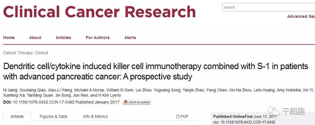 首都醫(yī)科大學(xué)任軍教授研究團(tuán)隊(duì)在國(guó)際期刊Clinical Cancer Research (IF=9.619)上發(fā)表論文,題目為“Dendritic cell/cytokine induced killer cell immunotherapy combined with S-1 in patients with advanced pancreatic cancer: A prospective study”。
